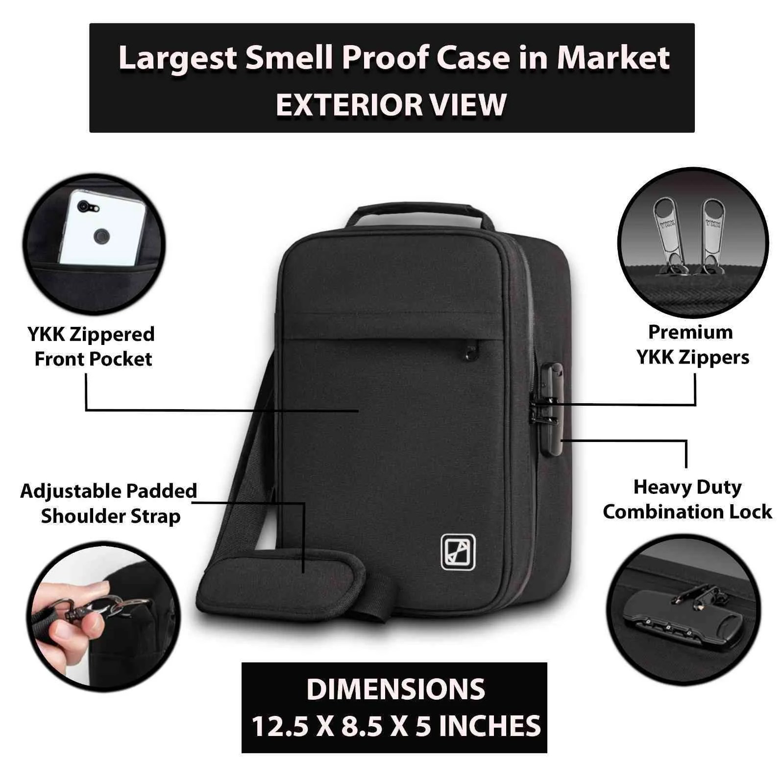 PRACTICAL FOR ALL YOUR NEEDS: Comes with removable, adjustable shoulder strap. Adjustable dividers and can be completely removed which gives you more freedom to organize and use the space you may wish. Perfect for spice storage, medicine storage, jewelry storage, coffee, valuables etc. The front pocket is designed for easy access to your items and is also water resistant. This smell proof travel bag is very suitable for travel, camping and home storage.